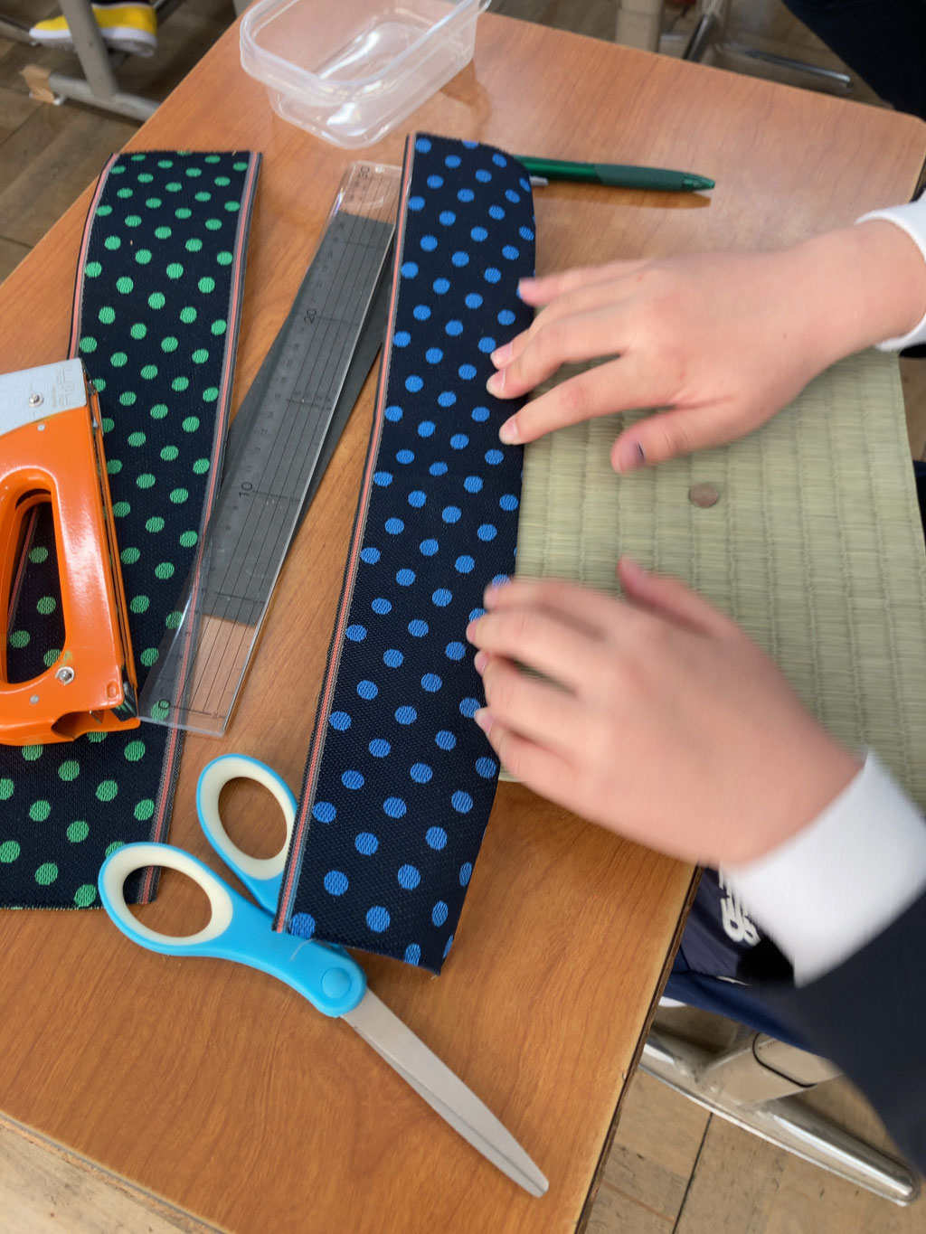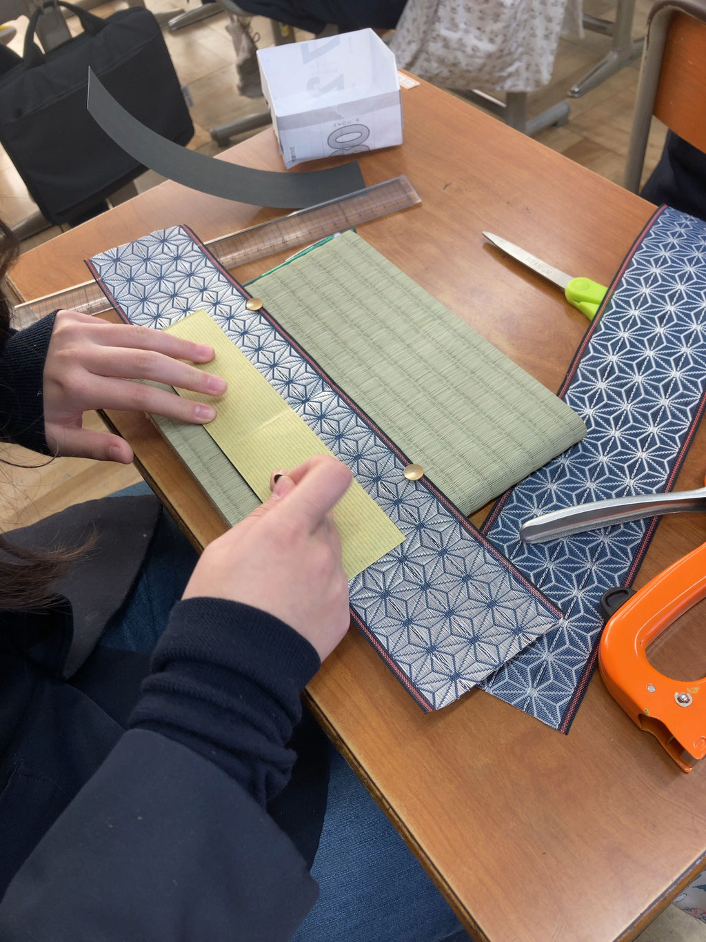 それぞれ好きな柄の畳縁を選んでミニ畳を作り上げていきます。ケガもなく無事に作業してもらえたかなと思います。